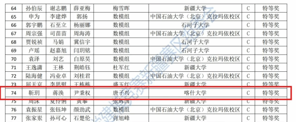 唐子兴老师指导靳玥、蒋涣、尹秉权同学组成的参赛队获得新疆赛区特等奖;叶建国老师指导丁昱、杨长春、艾则孜·阿卜杜热黑木同学组成的参赛队伍获得新疆赛区二等奖;唐子兴老师获得新疆赛区优秀指导教师,叶建国老师获得新疆赛区优秀管理者名单;喀什大学获得赛新疆赛区优秀组织奖。