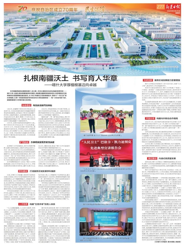 从简陋校舍到现代化的“一校三区”,从单一师范教育到综合性大学,从默默无闻到特色鲜明,喀什大学的发展历程,是新疆高等教育事业发展的生动写照,是推动中华民族共同体意识在边疆高校落地生根的生动实践。站在新起点,喀什大学全体师生员工将以更加昂扬的姿态,扎根南疆大地,勇担时代使命,向着建成全国知名、新疆一流、在中亚有重要影响的现代化综合性大学目标迈进,为建设教育强国、办好人民满意的教育,为实现新疆社会稳定和长治久安总目标作出新的更大贡献。