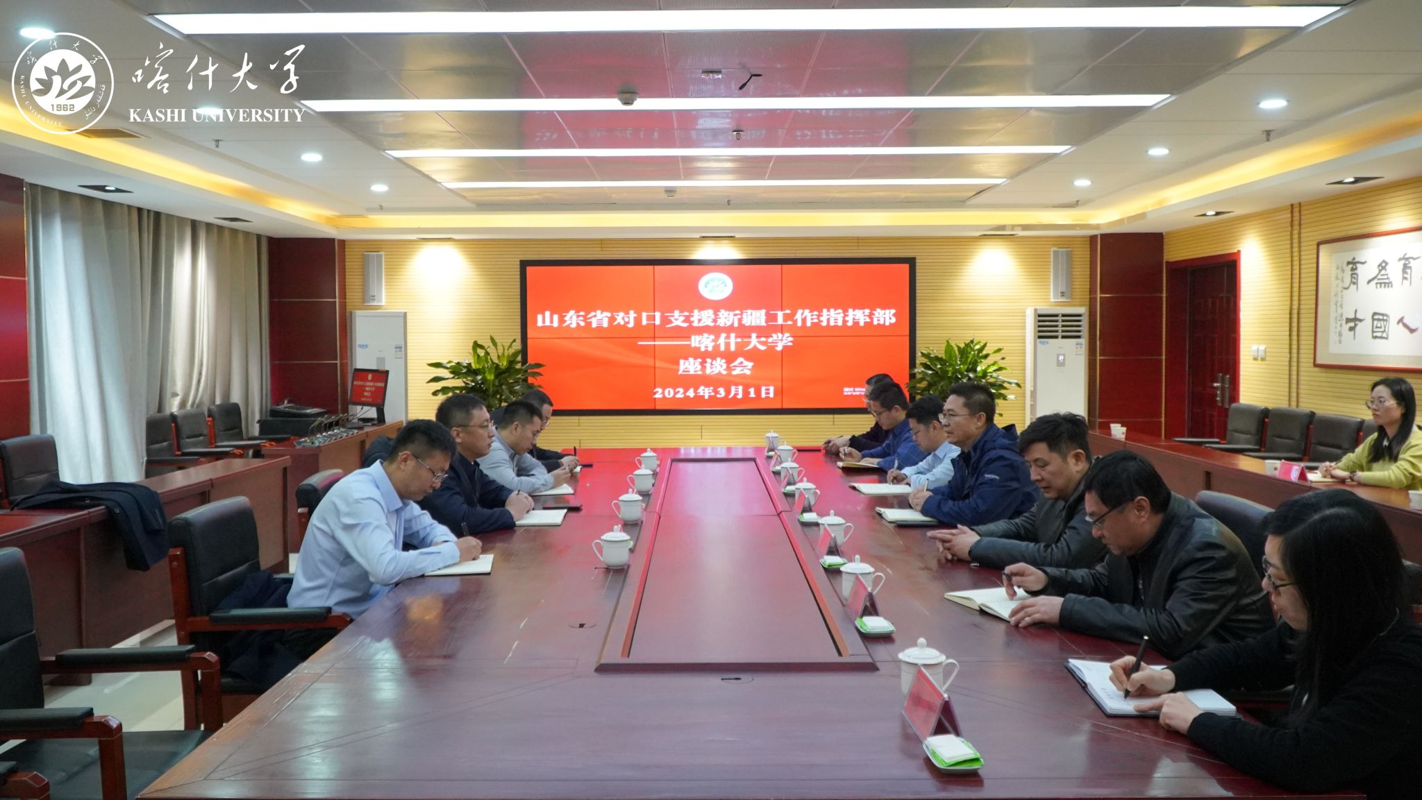 3月1日,山东省援疆指挥部党委副书记、喀什地委组织部副部长王福刚一行来富易堂rich88手机版:调研交流。校党委常委、副校长罗浩波陪同调研并座谈,学校相关部门、学院负责同志和山东省援疆教师代表参加座谈。