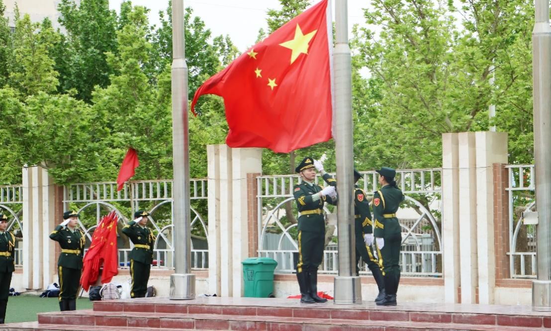 运动员入场后,在庄严的国歌声中,在场的领导、师生肃立致敬,高唱国歌,国旗仪仗队升起了鲜艳的五星红旗。