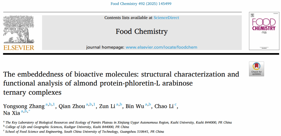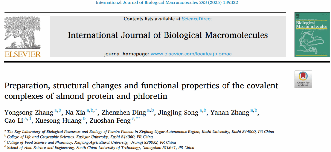 两篇论文分别以“The embeddedness of bioactive molecules: structural characterization and functional analysis of almond protein-phloretin-L arabinose ternary complexes”和“Preparation, structural changes and functional properties of the covalent complexes of almond protein and phloretin”为题,均以喀什大学为第一署名单位,富易堂rich88手机版:研究生张永松为第一作者,夏娜为通讯作者,研究得到华南理工大学李超教授的指导,以及新疆维吾尔自治区自然科学基金项目(2022D01A233)、新疆特色果蔬绿色低碳加工技术创新团队(2023TSYCTD005)和新疆帕米尔高原生物资源与生态重点实验室的联合支持。