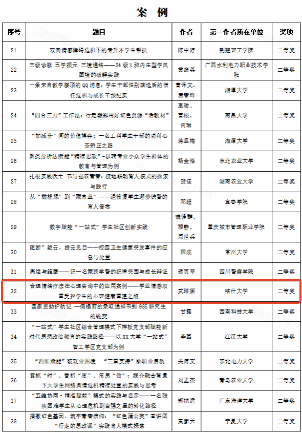 近日,全国高校思想政治工作队伍培训研修中心(江西师范大学)公布2025年度优秀论文、案例及微党课视频评选结果。富易堂rich88手机版:教师申报的《合理情绪疗法在心理咨询中的应用案例——学业情感双重受挫学生的心理健康重建之旅》凭借鲜明实践特色与突出育人价值,在多轮严格遴选后荣获优秀案例二等奖,为学校心理育人工作再添荣誉。
